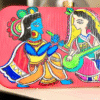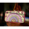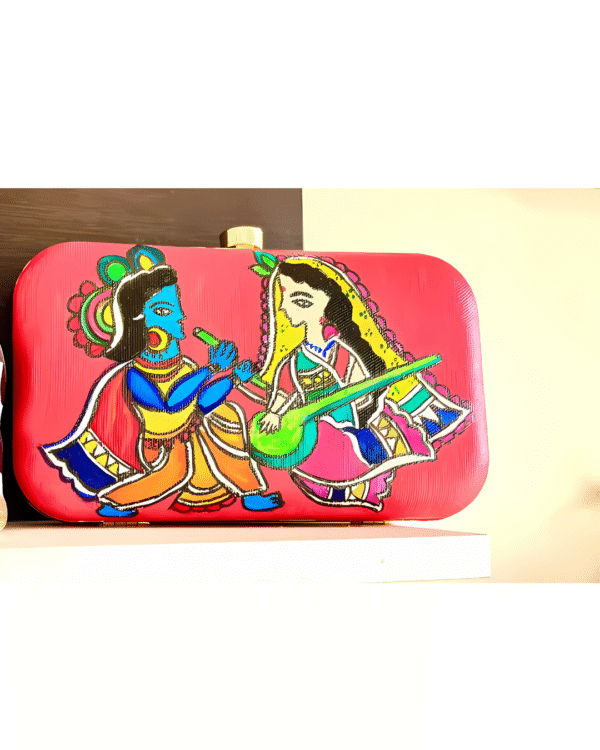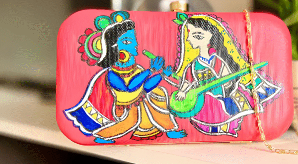 Turn heads with this Eternal Love & Lotus Bloom hand-painted clutch by LyricLooms featuring vibrant artwork on both sides. Celebrate the eternal love of Radha and Krishna on one side, and the blossoming beauty of a mandala lotus on the other. This hand-painted clutch is a work of spiritual art – perfect for festive flair and sacred style.. Crafted with traditional Indian artistry and modern flair, this piece comes with a gold chain for effortless elegance. A perfect blend of culture and contemporary chic for every festive or formal occasion.