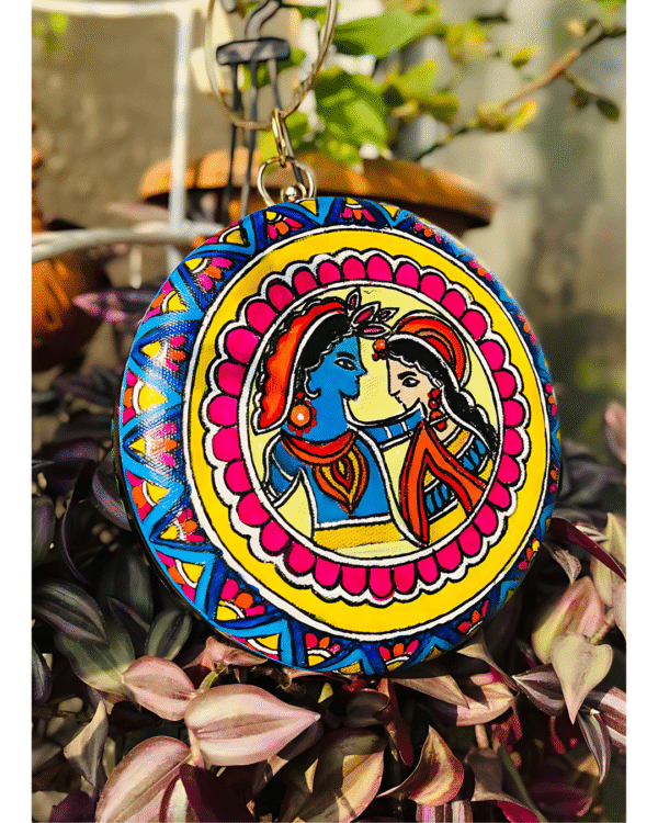 Turn heads with Eternal Love & Royal Feathers: Hand-Painted Madhubani Round Clutch by LyricLooms — a stunning hand-painted clutch that tells a story on both sides. Celebrate eternal love with this vibrant – clutch featuring Radha and Krishna in classic Madhubani style. Each detail is meticulously crafted to bring traditional Indian art to your modern wardrobe. Turn heads with the clutch’s reverse side, adorned with a stunning hand-painted peacock. The rich colors and intricate patterns capture the essence of Madhubani folk art, making this accessory a true statement piece.