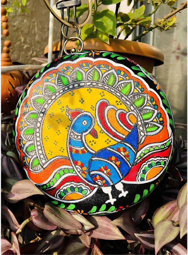 Be the first to review “Eternal Love & Royal Feathers: Hand-Painted Madhubani Round Clutch”