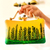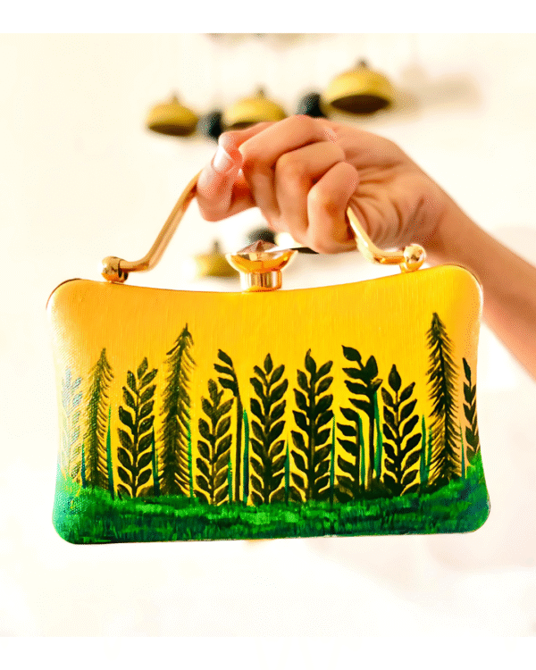Step into a world of artistry with this exclusive Fish & Forest – Hand-Painted Clutch by  LyricLooms, a true statement piece for your collection. On one side, a mesmerizing fish motif in vibrant blue, yellow, and white draws inspiration from traditional Indian folk art, symbolizing prosperity and fluidity. Intricate patterns and bold lines make this design pop against a deep background, creating a striking visual impact. Flip to the other side for a refreshing change: a serene forest scene painted in lush greens and golden hues.