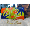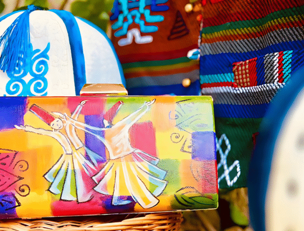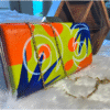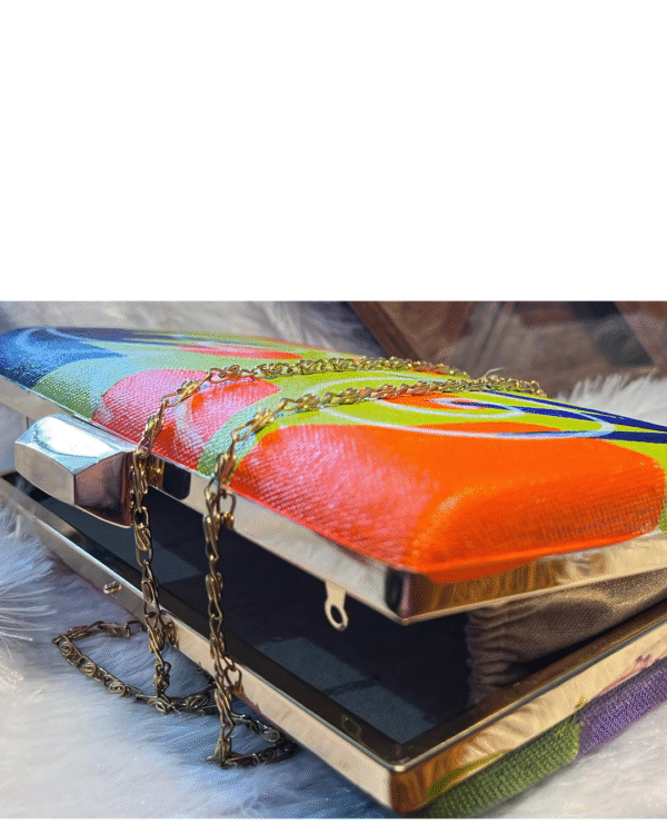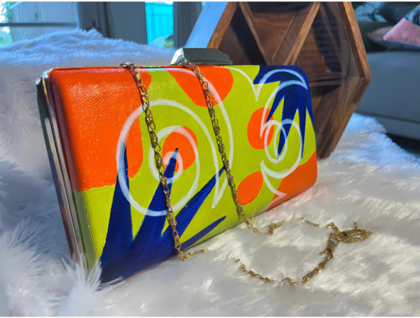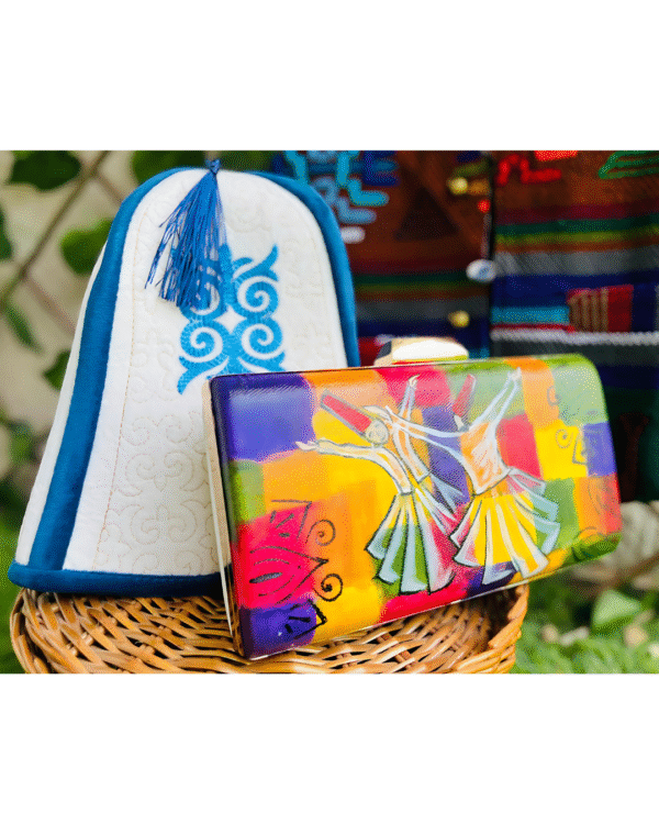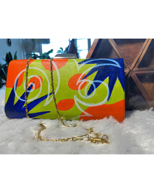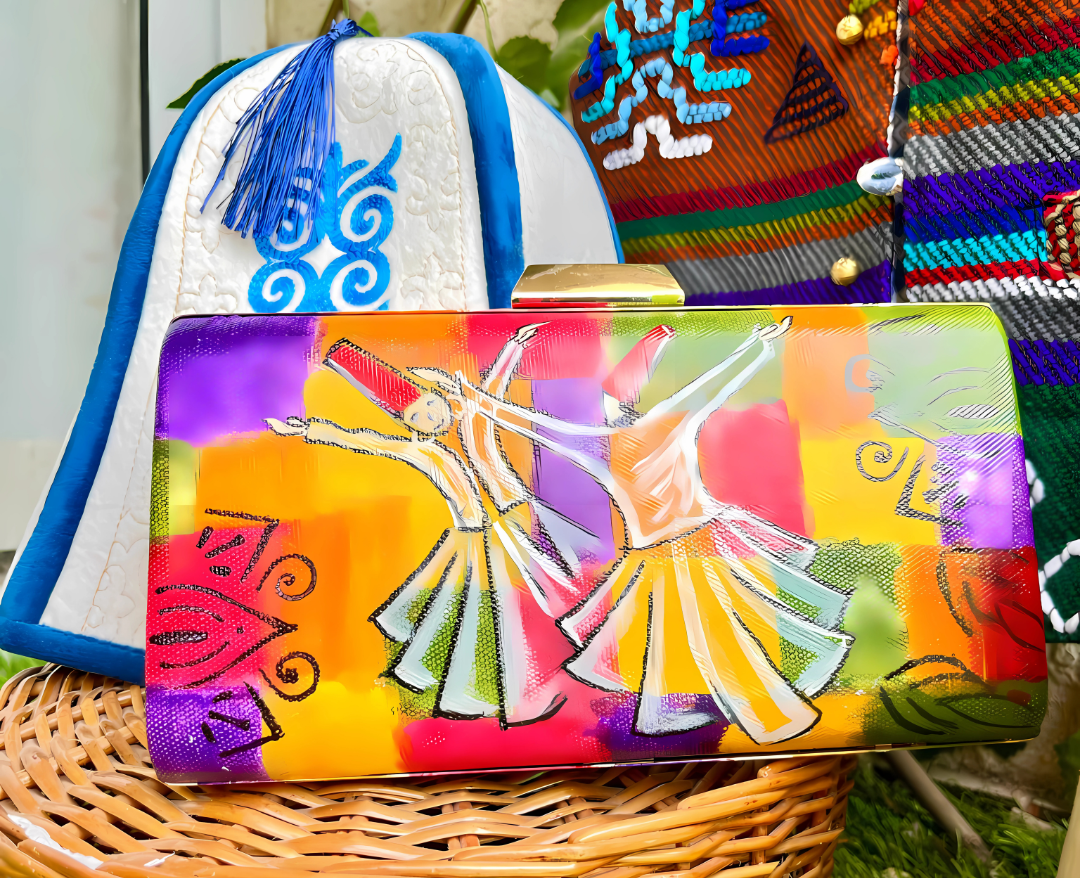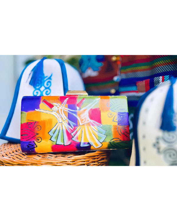 Unleash your style with this unique Whirling Dervishes & Abstract Swirl Symphony– Hand-Painted Clutch by LyricLooms. One side is adorned with a mesmerizing depiction of whirling dervishes, set against a radiant patchwork of purples, yellows, oranges, and reds. The expressive figures, captured mid-dance, evoke themes of joy, spirituality, and cultural richness. The other side of the clutch bursts with energy, featuring bold abstract swirls in vibrant hues of orange, lime green, deep blue, and crisp white.