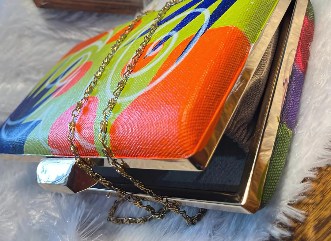 Crafted on a premium canvas base, with a structured gold frame and signature wrist ring, this clutch is more than an accessory— it’s a statement piece that celebrates individuality, creativity, and cultural heritage. Whether you’re dressing up for a special event or elevating your everyday look, this clutch ensures you stand out with sophistication and artistic flair. Perfect for Fashion-forward individuals seeking unique accessories or a unique gift that leaves a lasting impression.